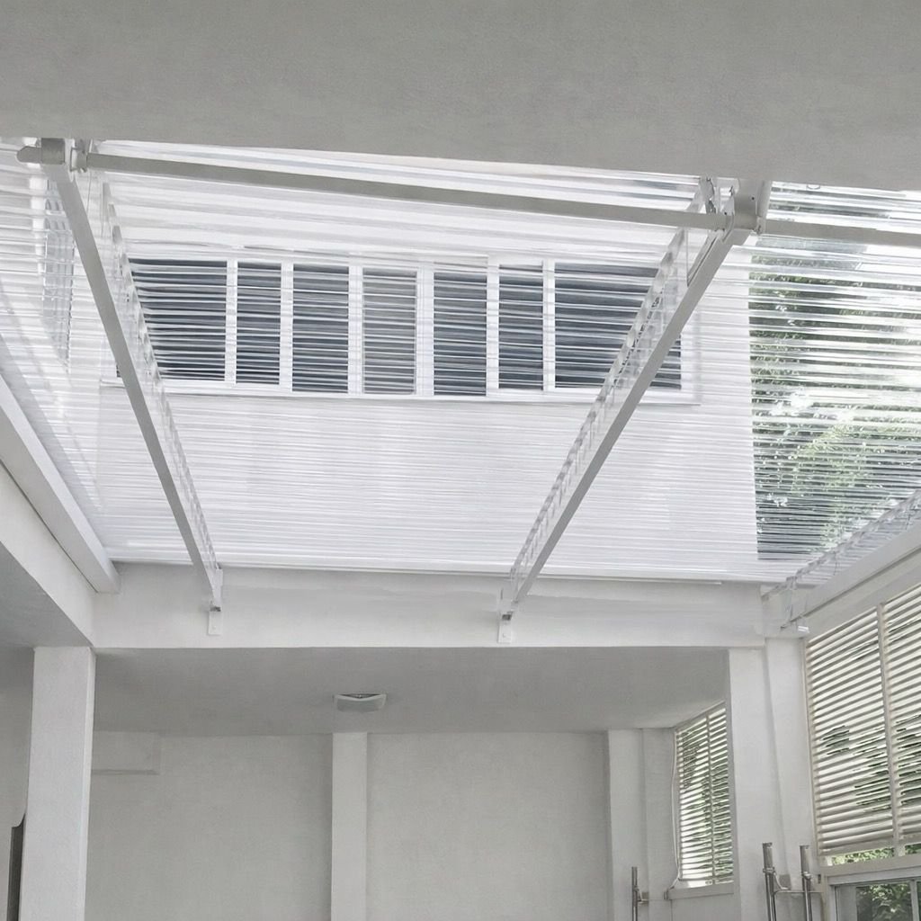 O máximo em versatilidade. Nosso sistema permite o controle total da ventilação e luminosidade. A opção mista intercalada é o equilíbrio perfeito: a resistência do alumínio com a entrada de luz do policarbonato. Ideal para áreas gourmet e churrasqueiras.