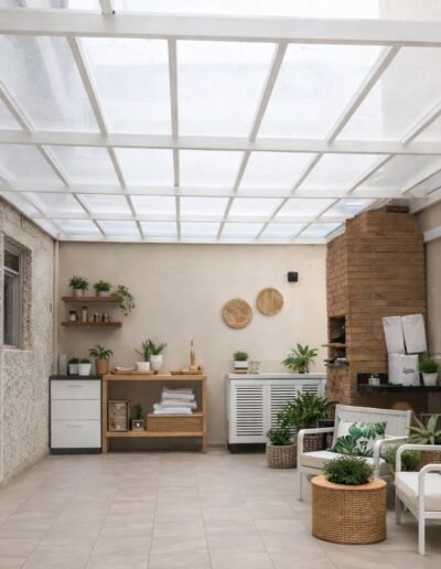 Trabalhamos com chapas de policarbonato de alta tecnologia que possuem tratamento contra raios UV. Isso impede que o material resseque e reduz a passagem de calor em comparação a coberturas simples. No entanto, se o seu foco principal for o frescor total, a cobertura de alumínio ou a mista são as recomendações mais indicadas.